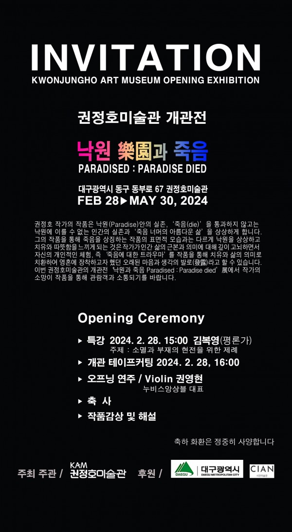 권정호미술관 개관전 페이지 정보 작성자 관리자 작성일24-02-16 15:53 댓글0건 관련링크 이전글 다음글 목록 본문 권정호미술관 개관전※자세한 내용은 사진 참고 부탁드립니다. 댓글목록 등록된 댓글이 없습니다. 이전글 다음글 목록